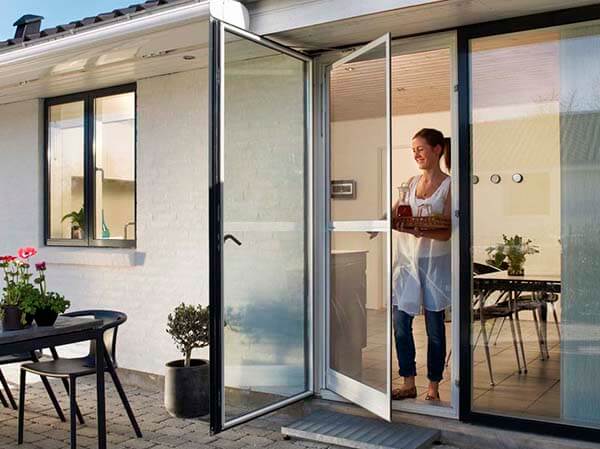 Монтируются на входные или балконные двери. Распашной механизм позволяет легко открывать и закрывать дверь, не теряя защиты от насекомых.